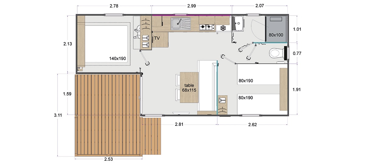 La superficie della casa mobile è di 26 m2, la superficie della terrazza esterna è di 8 m2